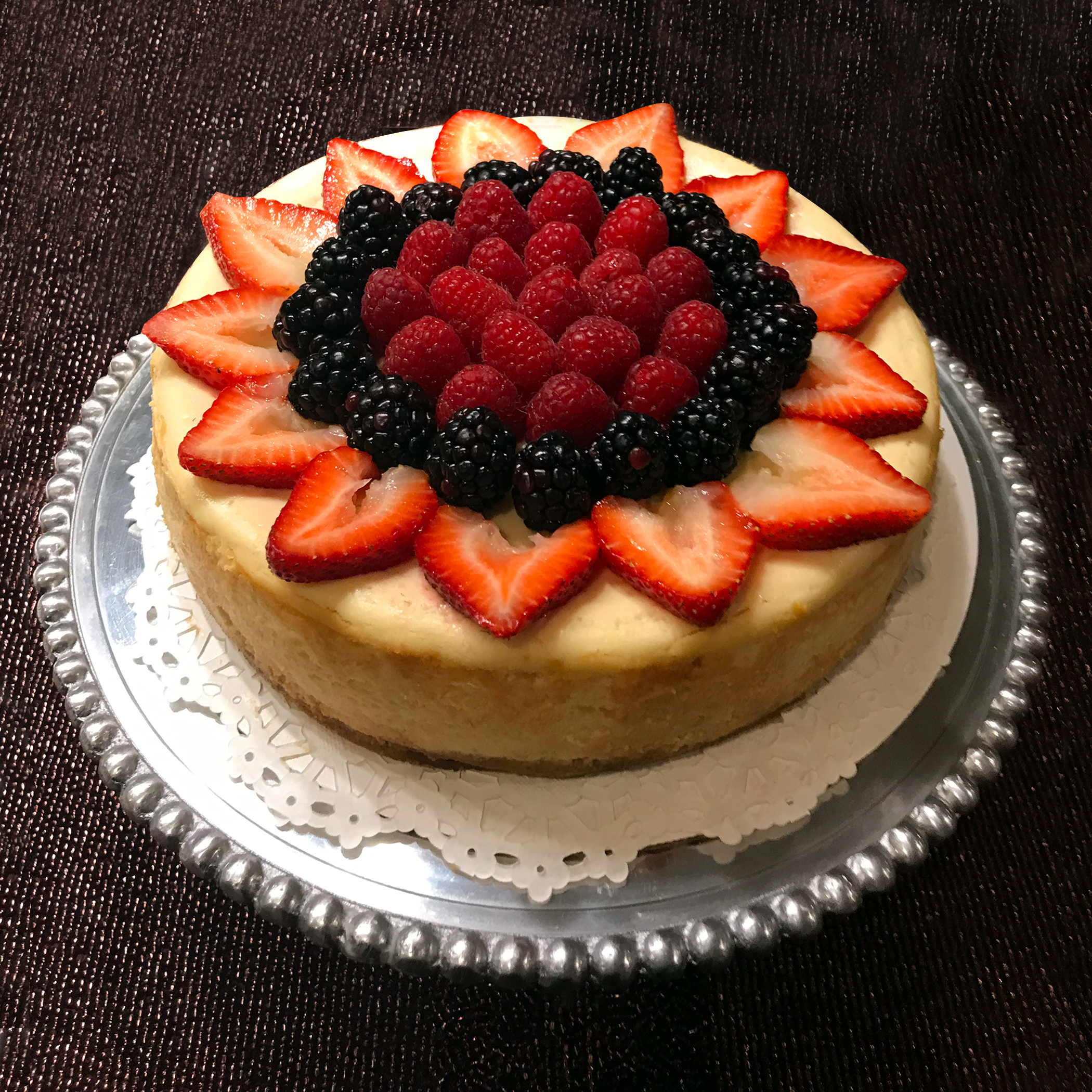 8. To Serve: Remove the sides from the pan and blot any moisture from the top of cake with a paper towel before slicing and topping with Strawberry Glaze, berries or topping of choice.