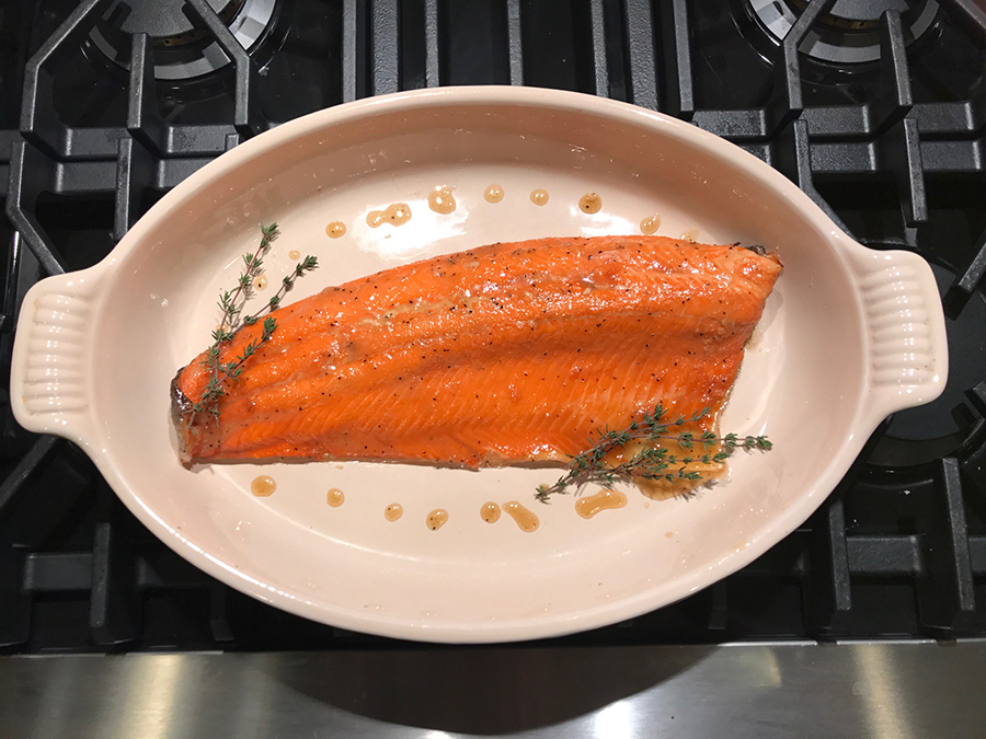 non-aerosol cooking spray4 (4-5 oz.) fresh salmon or steelhead trout fillets or 1 whole fillet weighing 1 ¼ to 1 ½ lbs.